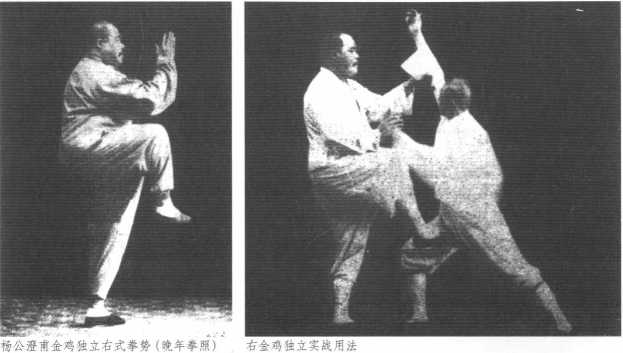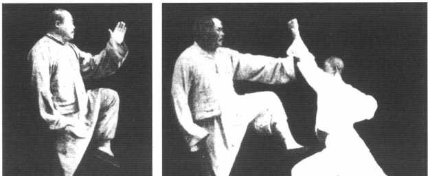 右式:由单鞭下势式,设 敌以右脚在前用右手向我胸部 击来,我急转左脚尖,起身用 右手在故人右腕下向上棚住, 随用左手在敌之右肘下托住, 急用右膝盖直顶敌之小腹,同 时松腰胯,左足微曲直立,重 心寄于左腿,如金鸡独立势, 设敌人用左手向我胸部打来, 我即用右手扣住敌之左手腕。 如敌人用同上位置以右脚在前 用右手击我胸部,我急用左手 粘住敌腕,右手由敌之肘下向 上绕一小圈,握住敌右腕,左 手握住敌之右肘,向后退半 步,用采劲向右膝外采下,如 敌失去重心,侧身退后一步, 向后坐腿,同时抽回右拳,我 即转左脚尖,重心寄于左腿, 同时提起右脚用 足尖向敌人 小腹踢去,此变化也。