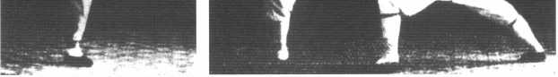 左式:由右金鸡独立式, 设敌人以左脚在前用左拳向我 胸部击来,我右脚急退后半步 坐实,随用左手背接住敌腕, 旋翻左掌握住,同时提起左脚 用足尖向敌人小腹踢去,右手 沉下,以称其势,右足微曲直 立,重心寄于右腿,虚灵顶劲, 眼神贯注敌方。