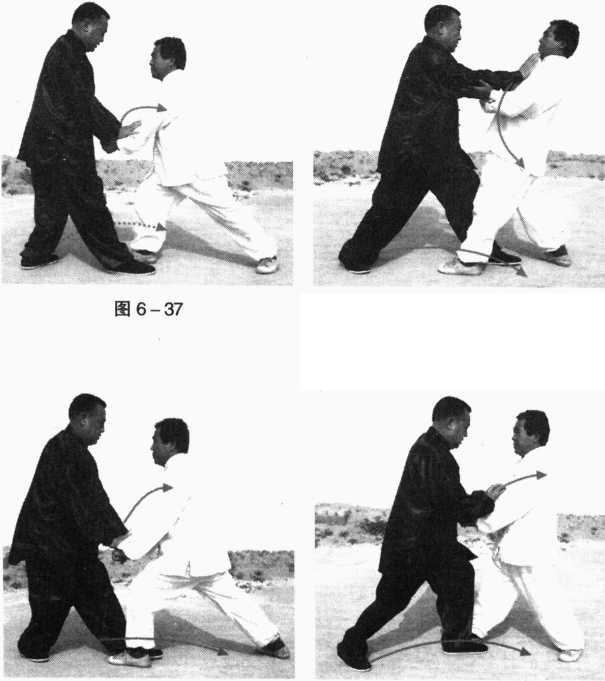 我向对方双手扑面攻击,对方迎击化解反击,我即顺其力向 后撤步,双手顺力后化解下捋引进,使对方失利。我即乘机反 攻,双掌卷曲向前,向对方腹部突然攻击,力达掌根。此法为虎 托掌,要注意在反攻时形成老虎坐窝,足先手后,手托身坠,使 对方向后跌,失重受损(图6-37、图6-38)。