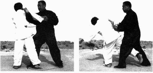 注意:反击扑面,两肘夹肋,掌至对方身体先上搓,即内旋手心| 按推扑胸。在上搓的同时,紧跟上步,下按着力以寸劲弹抖将对方击出。