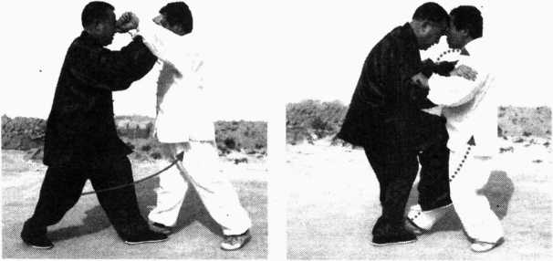 对方来势凶猛,我以双掌迅速出手前扑,点打着力,即吸胸 凹腹,退步吸引,双手牵引内旋外撑,裹肋束身。对方落入,我 即以猛虎扑食向敌反击,以河水决堤之劲,以头部向对方前胸、 颈部顶撞,腰腹向前摧攻,形成合劲,退步吸引,身坠反弓,头 部由下向上方冲起。在撞头的同时后腿提膝,向对方裆部猛烈攻 击(图 6-44、图 6-45)o