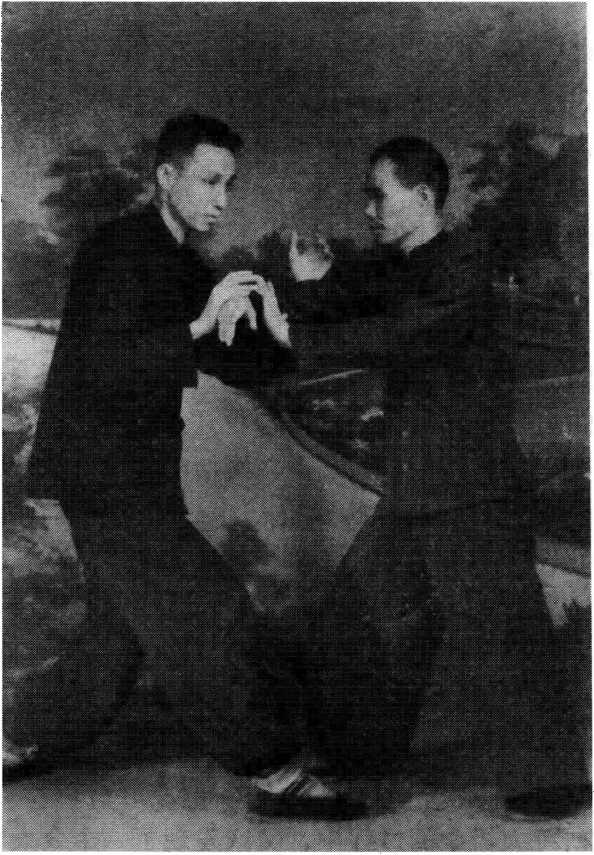 经过一段时间认真的理论学习和实践摸索,父亲对太极拳有了 较为深入的认识。他认为太极拳的精要在于“阴阳相济"而所谓 “一柔到底”说法显然是错误的。他又认为太极拳的推手应有内劲 为物质基础,而且在运动时应处处以螺旋形式进行,方能有效地转 化外力、控制外力。他将这个认识应用于推手实践中,把太极拳的 身法调节与脊柱的调节联系起来,做到以腰脊“命门”为中心统 领全身,从而产生强大的弹性力,再将这种弹性力贯穿于推手时的 螺旋运动之中。不到半年的时间,父亲的推手水平突飞猛进,一下 子超越了所有的师兄弟们。此事也惊动了赵老师,一天课后,赵老 师特意将我父亲留下与他做一次认真的推手,结果我父亲以绝对的 优势获胜色这对有数十年拳龄和多年授拳经历的赵老师产生了很大 的震动,但他也为有这么一位超群的学生感到骄傲(图1-1-2)。 随后父亲在与汕头及来访的各家各派的太极拳师交流时,均表现出 明显的优势,轰动了当地的太极拳坛。学习推手仅有短短一年半的 时间就已达到如此高超的水平,这不能不说是父亲的又一个奇迹。 后来,.父亲在给顾老的一封信中说道:“读苏联德?德?顿斯科依 著作《运动生物力学》启发很多,用一些运动生物力学的概念来 理解太极拳推手,很是便捷、明确。熔之于心,铸之于手,近来推 手的进步连自己都觉得有点出奇。师友们对我的学习方法,也都十 分感兴趣。陈鑫说:'学拳先要读书明理'。在一定的意义上说, 虽然'离开实践的理论是空洞的理论但'离开理论的实践是盲 目的实践‘(斯大林语)。陈鑫的话是正确的。功夫上身,是在实 践。'空谈涨墨',于事无补,一定要坐言起行,’实践一认识一再 实践一再认识,以至无穷'(毛主席语)。但一个人直接的经验是 有限的,必须接受别人积累的经验。读书就是方法之一。”这些话 充分反映了父亲对知识、对真理的执着追求,也体现了知识化为力 量的真义。就是这样,父亲每天清茶淡饭,却从太极拳中得到了极
