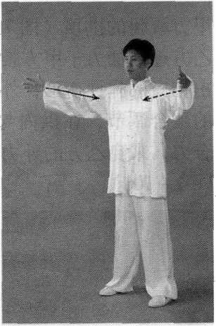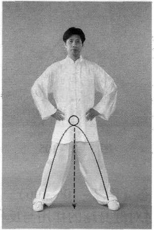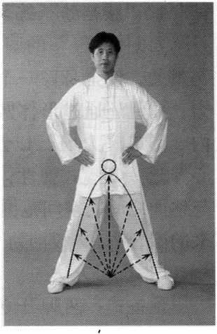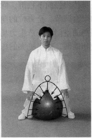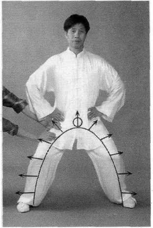 “以体导气”的调节,不单于体内促成“内气”与能量的聚合 与贯通,使全身像一个充气的橡皮人或气囊,富于弹性和充满压 力,而且还通过形体圆弧形的调节,在身体姿势环抱的空间范围 内,形成“力场”以及“内气”的聚合活动,在“太极气势中 心”这一气囊式弹性体内产生强大的压力。“腰裆劲”,是在两腿 与地面之间的空间范围内,由意、气与腰腿的一系列调节而产生出 来的聚合力,“腰裆劲”是“太极气势中心”的重要组成部分。