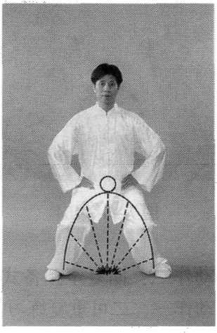 动作一:首先,用意想像于腰腿和地面之间的空间,置一大气 囊。身体慢慢向下松沉,同时,于腰腿内拱的所有质点,一起做向 心的聚合调节,全方位的向想象中的气囊做向心的挤压动作,从而 在腰裆的空间范围产生力场和合力,而气囊的压力反作用于腰腿内 拱璧和地面,产生更大的压力(图7-1-102)。