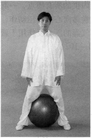 预备式:置一大健身球于两腿之间, 做好“五弓合一”和“丹田出四梢”的 调节(图7-1-104)。