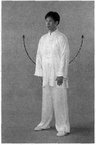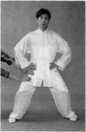 预备式:两脚开立比肩略宽,两手叉腰,完成“五弓合一” 和“丹田出四梢”的调节(图7-1-101)。