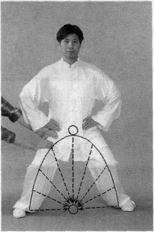 乙方逐渐加力于甲方腰腿的拱形结构上,如果甲方的腰腿松沉 而做出相应的弹性变形,外力和本身的调节力均通过拱的内壁,做 向心的聚合调节,在拱内与地面之间的空间,便形成“力场”和 产生合力,来自乙方的外力则被缓冲转化并加强甲方的“腰裆劲”