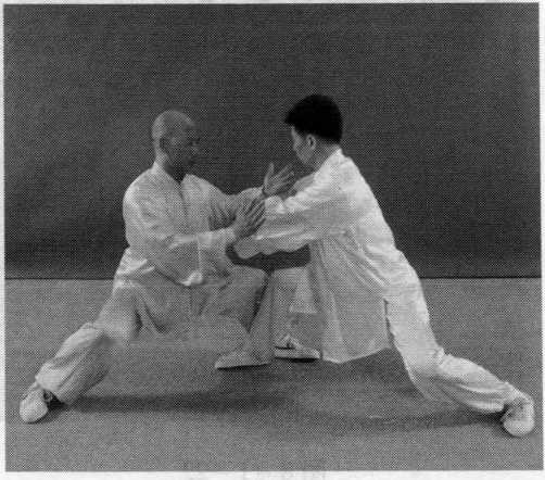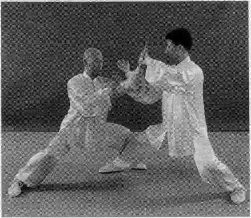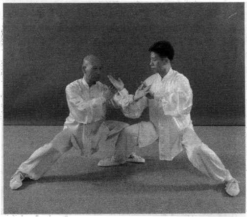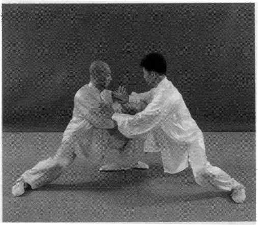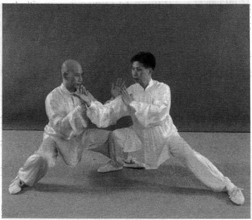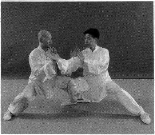预备式:甲方出右脚下沉成马步,右臂前伸,掌心朝上,左手 置于右肩前;乙方出左脚踏于甲方右腿外侧,两膝相靠,右手搭于