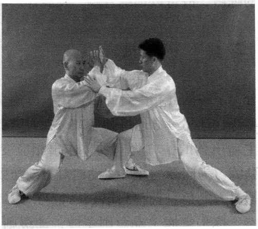 动作一:甲方右转成弓步,左手曲臂前挤,右手顺乙方左前臂 下摆,掌心朝下;乙方顺势微左转,左手腕与甲方左手腕互搭,右 手轻按甲方左肘关节处(图8 - 1 -20)。