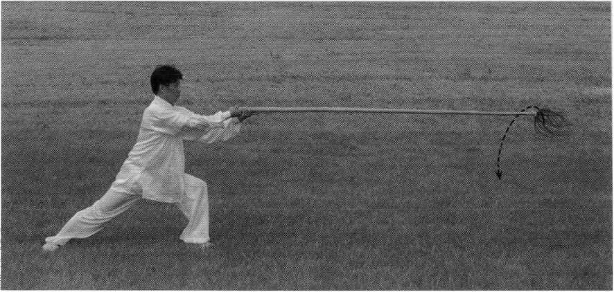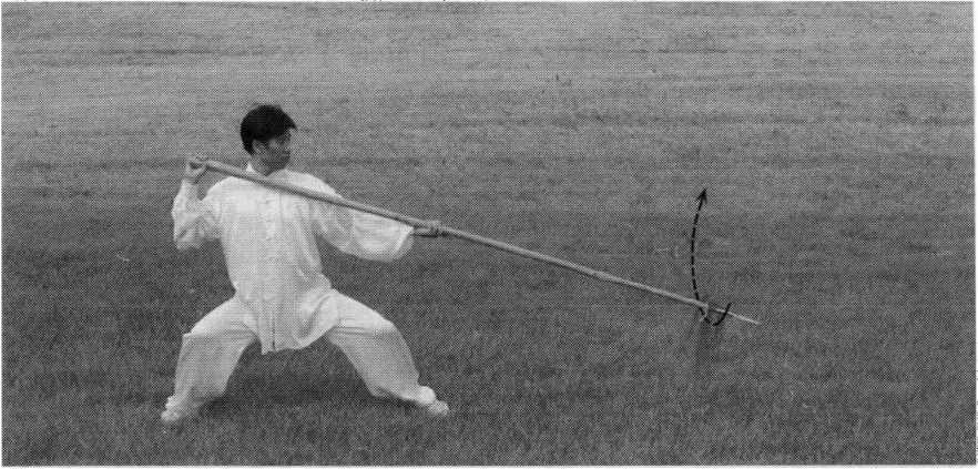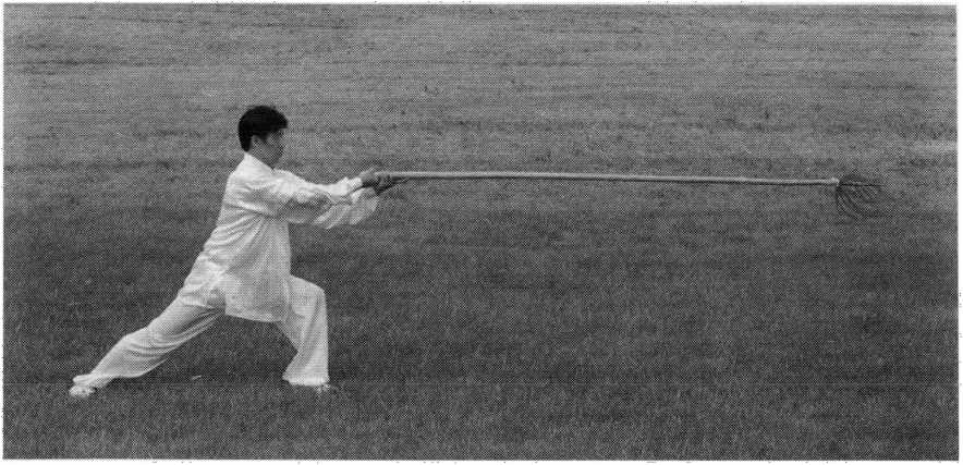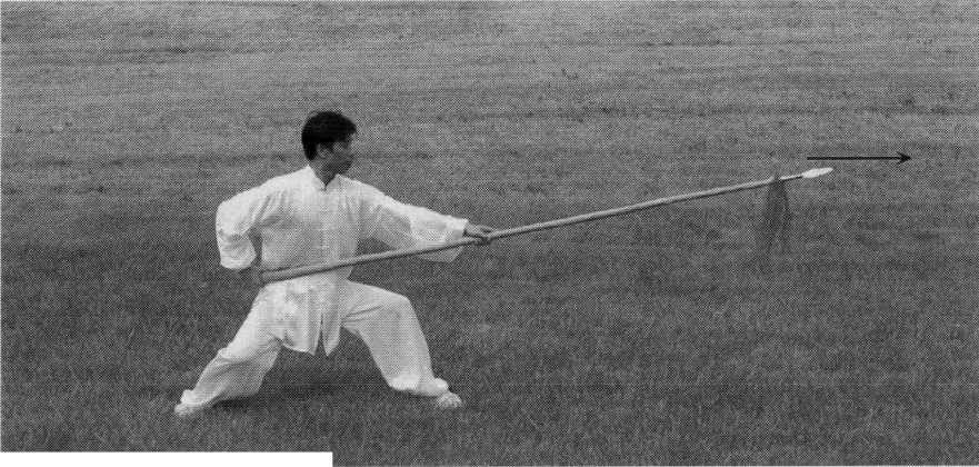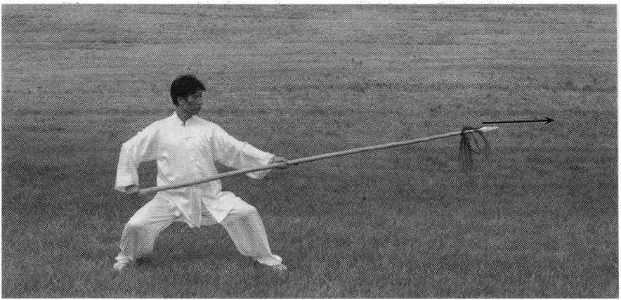 动作一:“丹田”带动身体左转前移成左弓步,左手外旋,掌 心朝上,举于胸前平托枪杆;同时,右手在整体劲的催逼下,将大 枪顺着左手向前急速发劲扎枪,劲贯枪尖(图7-4-2)?