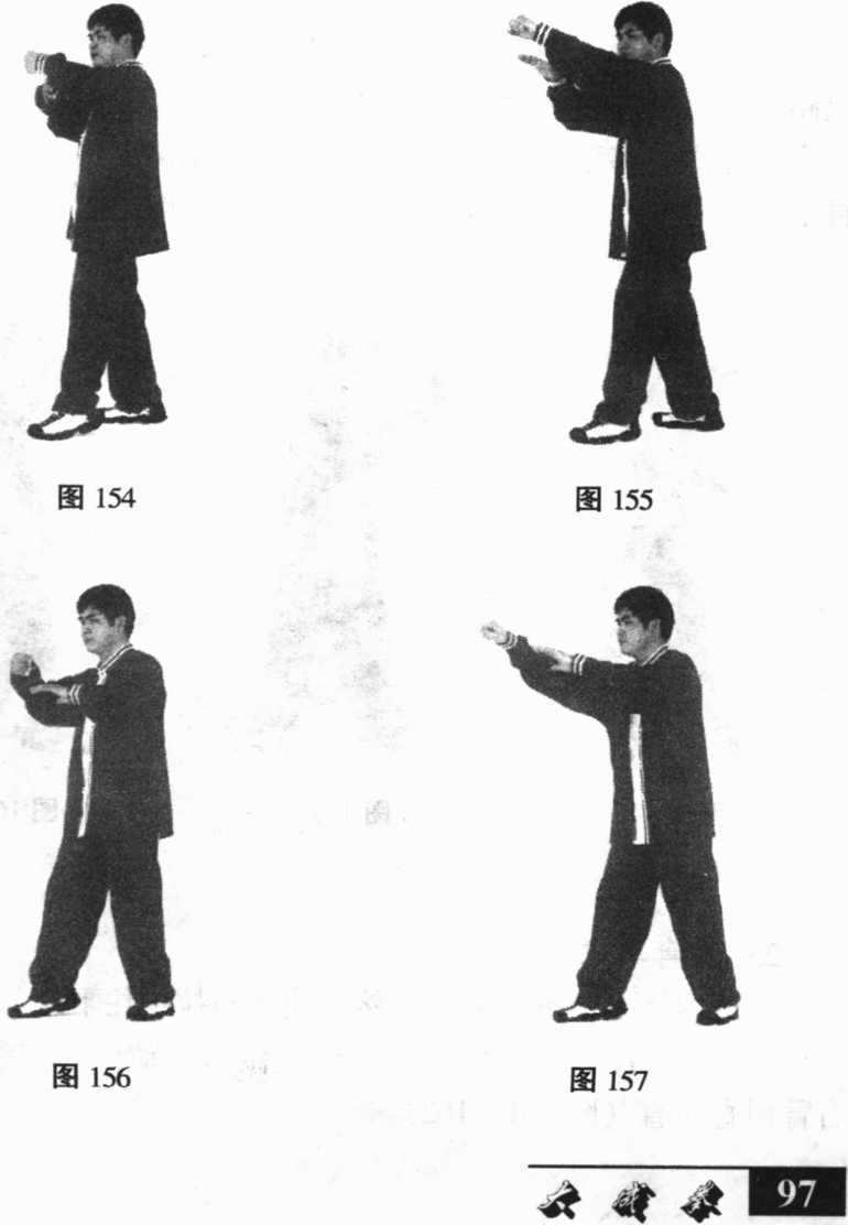 左拳变掌,两臂外旋,掌心斜向相对,然后,右脚向前迈一 大步成右丁八步,两掌向后回拉,仍至身前将一尺距离时,翻转 手腕向下,并使右掌略前于左掌,与此同时,右掌变拳,左掌配 合右拳缓缓向前推出(图156、157)。
