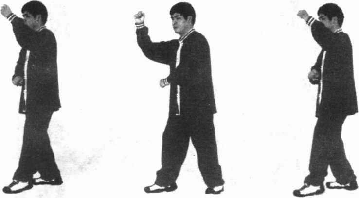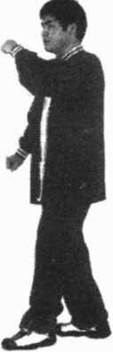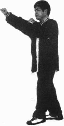 身体重心移至左腿,右脚向前迈一大步成右丁八步,同时左 拳由上向右下方做顺时针的弧形运动,至右肋前约半尺距离处, 拳心向内,右拳由下向右上方做逆时针的弧形运动,至头部约一 尺距离处,拳心斜向内(图159)O