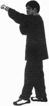 身体重心移至右腿,左脚向前迈步成左丁八步,两掌边内合 边往回拉,使之与自身将近一尺距离,左手略前于右手,然后两 臂内旋,左掌变为空握拳状,右掌配合左拳缓缓向前推出,至两