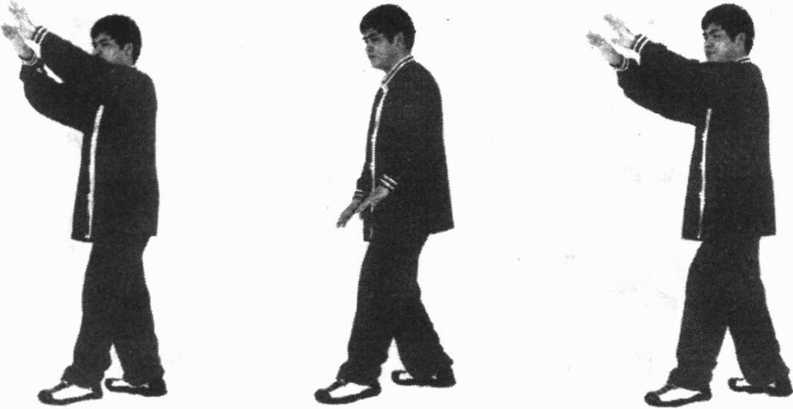 身体重心移至右腿,左脚向前迈一大步成左丁八步,同时两 臂继续在身前做左顺右逆的弧形轮轴动作(图160)。
