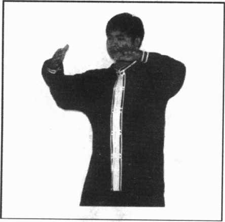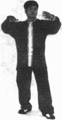 大体与矛盾桩相似,以左式为例:下肢同提插桩(不必象矛 盾桩那样要求裹胯),两臂抬起,左臂在前,与肩同高,左掌心 斜向右后方,与自身约一尺二寸距离;右臂在后,略低于肩,右 掌与自身约一尺距离,掌心向下,指端斜向左掌心,两手约一尺 距离(图281)。