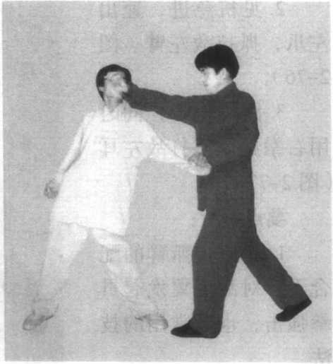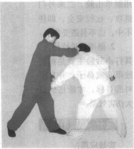 跟进,防止敌低头躲避。发拳时爪拉身拧,要打出爆发力,对 位要准,给其侧耳凌厉一击。