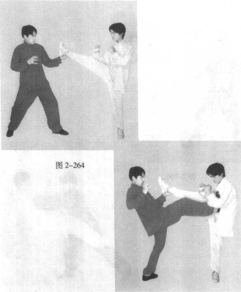 实战应用:1 .左势对敌。2 .敌向我踢来,我先用左爪,托腿接住(图2-262 )。3 .快速反击,再用左腿,猛劲撩踢敌阴部(图2-263 )。第二章虎拳技击法第二章虎拳技击法第二章虎拳技击法第二章虎拳技击法