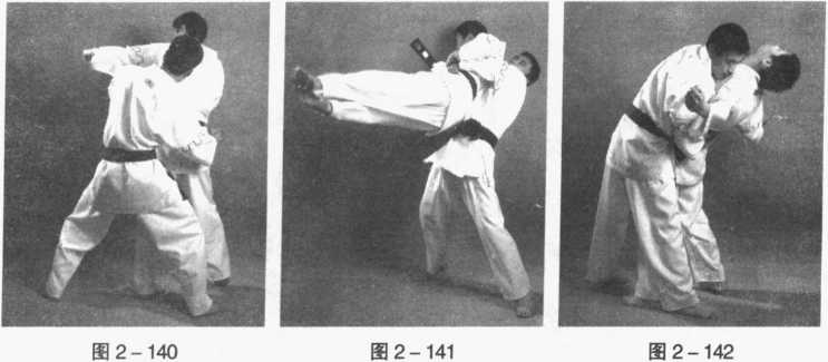 对手用左摆拳击打我头部,我用闪躲到对手左后侧,双手搂住其腰部,右脚 上步,落在其两脚后,胸部贴紧对手身体左侧,挺胯,用右膝顶其左大腿,把对 手抱起,同时右臂向左推,左手向右推,向右转体,甩脸将对手摔倒。(图2- 140、图 2-141)