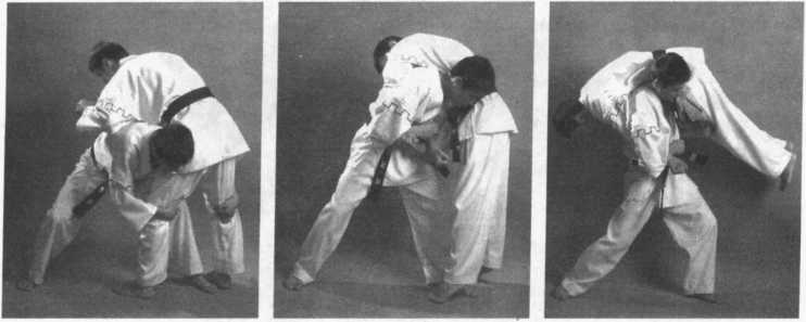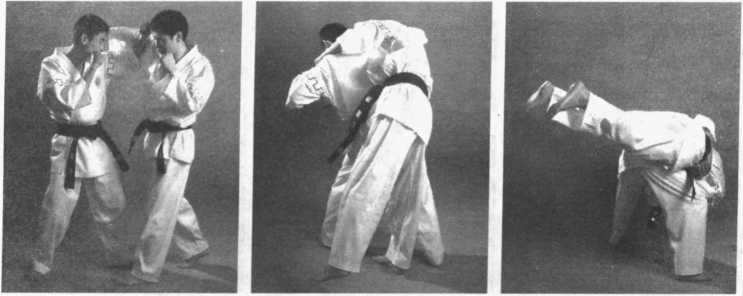 当对手用右摆拳攻击我头部时,我迅速用左前臂向外格挡并搂抓其手臂;上 右步落在对手右脚前,同时右臂屈肘夹其颈部;向左转体,左脚与右脚平行,背 转向对方,两腿屈膝,用右侧臀部抵顶住对手腹部,两腿蹬伸,向下弓腰、低头 将对手背起后摔倒。(图2-148、图2-149、图2-150)