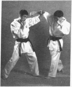 对手用乱拳击打我头部,我用两臂格挡,右脚上步,落在对手左脚左侧,屈 膝,左脚上步,双手抱住其腰部并用力勒,同时用肩、胸压对手胸腹部,头向侧 向贴紧其身体,上体前倾,使对手向后摔倒。(图2-142)