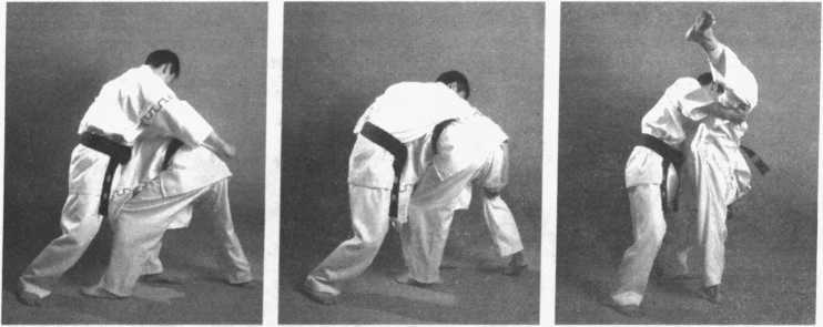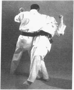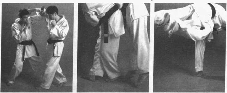 当对手抱住我左腿膝关节部位时,我立即重心下沉,用左手按压对手的后颈 部,右手由内向外推托其右膝关节,左后转体将对手向左侧摔倒。(图2-159、 图 2-160、图 2-161)