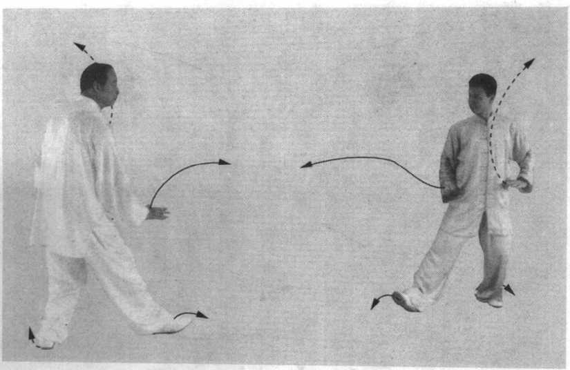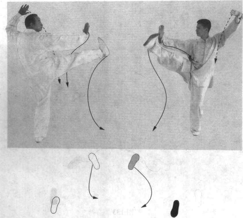 该动为吸取陈式太极拳的动作,提腿时配以吸气,蹬脚推 掌时配以呼气以助爆发力。须注意外三合,即右手与右脚、右 肘与右膝、右肩与右胯须上下对照。年长的朋友也可蹬的高度 降低,也可不发力做慢动作。