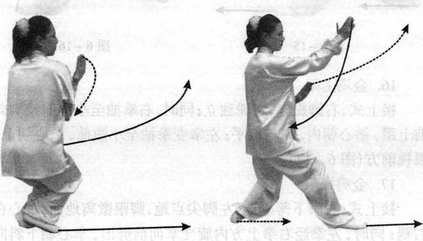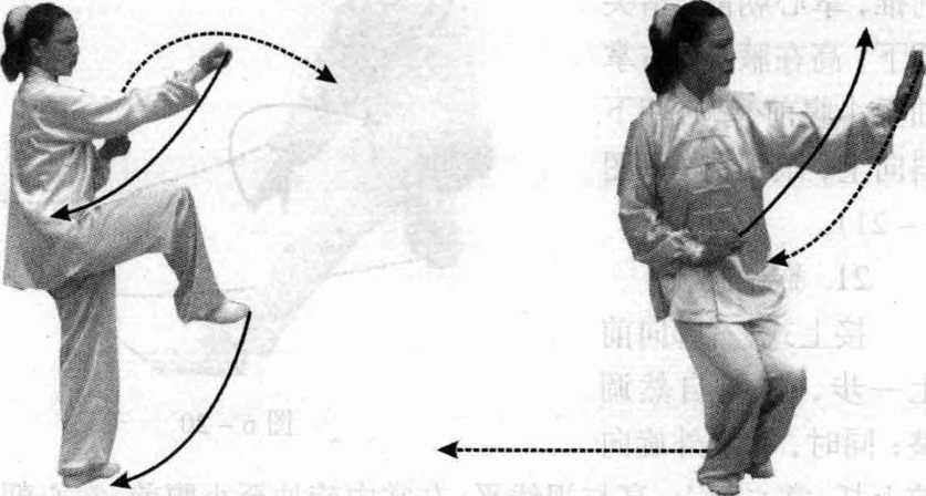图 6-20图 6-20上一步,左脚自然调 整;同时,右掌外旋向 前上托,掌心朝上,高与视线平;左掌内旋抽至小腹前,掌心朝下 斜向上,眼视前方(图6-22)。