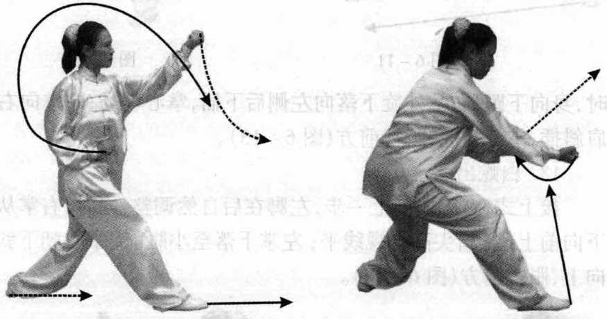 接上式,右脚向前刺, 重心在左腿;同时,右掌向 上往后带向下顺身向前刺, 左掌向上往后带向下顺身 向前刺,眼视前方(图6-