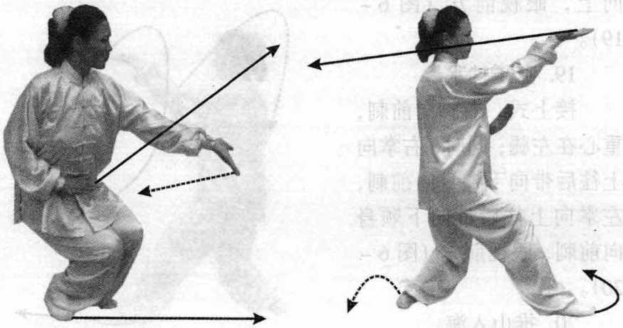 接上式,右脚下落原地,左脚尖点地,脚跟微离地面,重心在 右腿;同时,左拳经右拳上方内旋变掌向前劈出,掌心朝下斜向