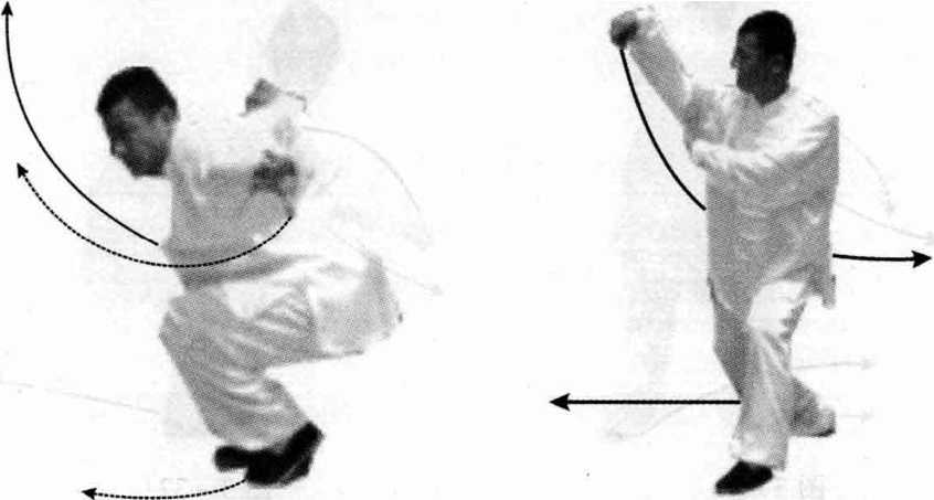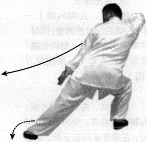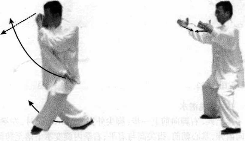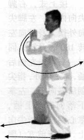 接上式,左脚向前上一步,右 脚在后自然调整;同时,右掌变钩