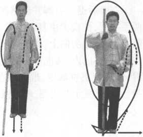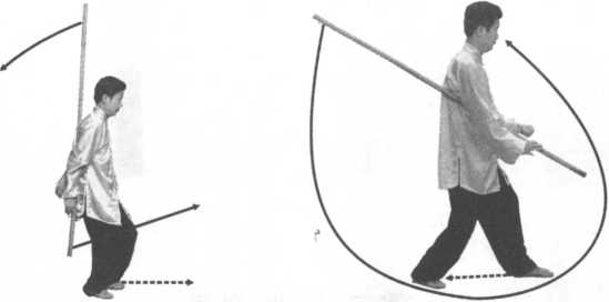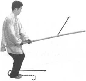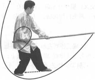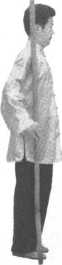 左脚向棍尖处迈进一步,右 脚跟至左脚内侧,并步站立,右脚 尖对棍尖;棍尖不动,同时右手持 棍,右臂内旋,使棍把弧形摆于胸 前,手心向右,虎口向下,棍直立 于身前;左手从身左侧内旋划弧 经胸前向下按至腹前,手心向下,