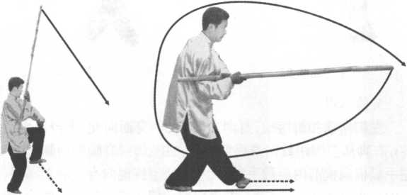 图 9-74图 9-74右脚经左脚内侧向后撤一步,成三体式左桩步;两手握棍,使 棍尖向下、向右后绕行,再由后上向身前劈棍,棍平直向前;两手持 棍在右胯前,右手在后手心向 左,左手在前手心向右;目视 棍尖(图9-74)0