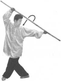右脚抬起,用脚尖将棍尖向左一挑,然后向左前方迈进一步, 右腿屈膝,身向左转90。(身面向南);左膝提起与胯平高,左脚尖向 前,成右独立步;同时,右手握棍,使棍尖向上、向身右后绕行,再由 后下向身前竖立,棍尖向上,成右手外旋握棍,手心向右,虎口向 上,棍把置于手臂外侧;左手随之向外划弧,然后变拳向前圆肘撑