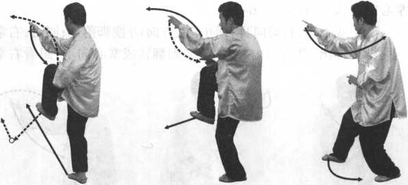 图 6-19图 6-19⑵上式不停,右脚向前垫步,右腿屈膝独立; 左膝提起,略高于胯部,脚尖上钩,脚掌向前,上 身向左拧转;同时,右剑指掌经左掌上向前上伸