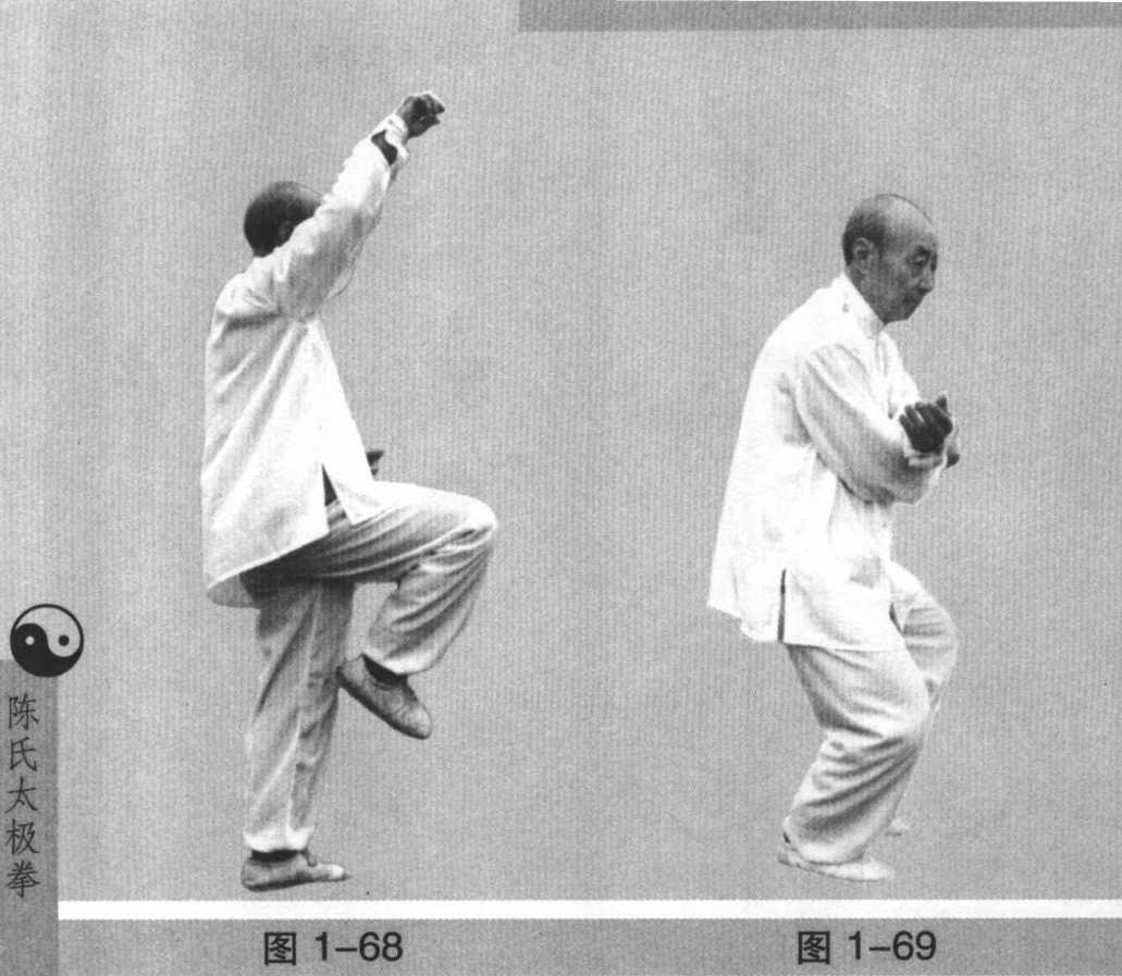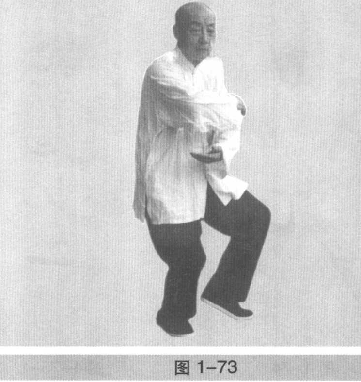 L身微左转,随即右转,左手内旋,手心反向左,画弧下 落于右肋内侧。右手成抓拳,由右胯外侧经右后弧形上缠至 右上方,同时重心全部落于左脚,右脚屈膝上提(图1-68)。