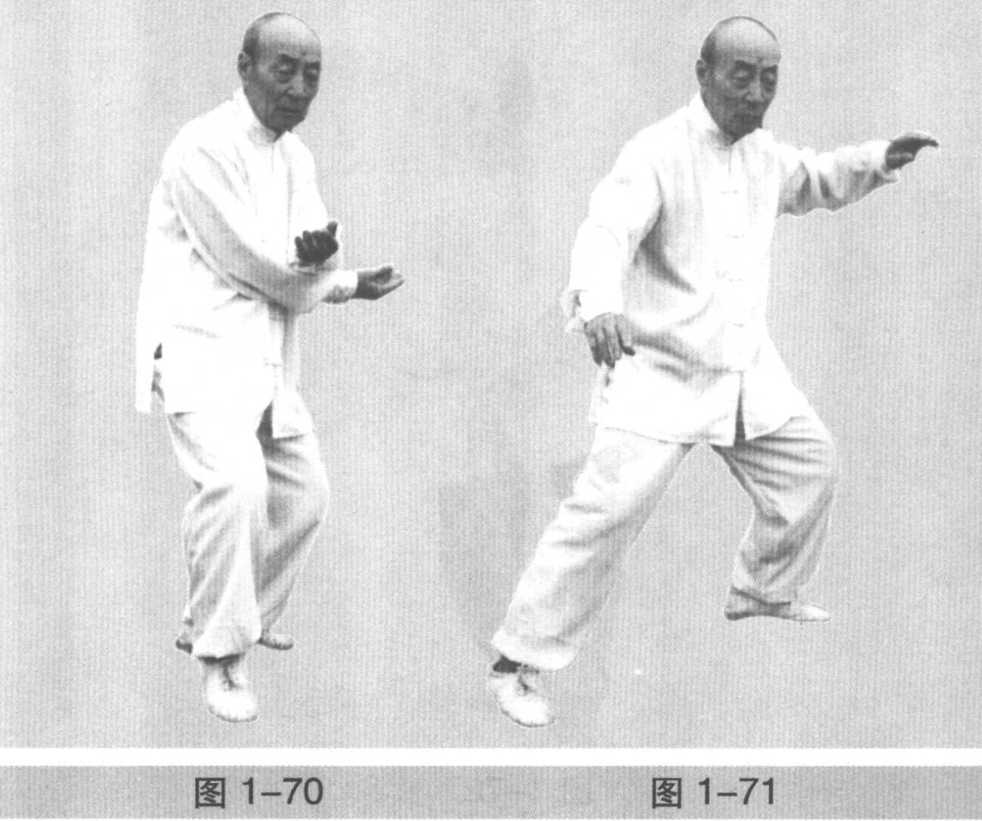 4 .左足向左后斜撤一大步,两手左右分开,右手下按于 右胯旁,手心向下,左手斜向左上搠,手心亦向下(图l-71)o