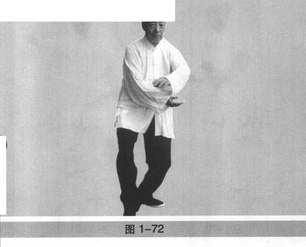 1 .身微左转,重心左移,右脚向后撤步,虚点于左足旁, 两臂合于胸前,左手在上,右手在下,两手心皆向上(图1- 72)。