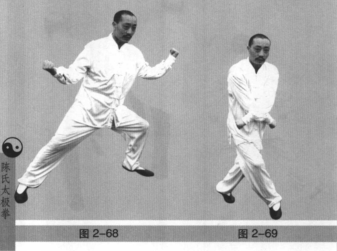 右足落地震足,提起左足向左横迈一步,重心左移,成 左弓步,同时双拳双分向左右横击发出弹抖劲,拳心皆向 上(图 2-67、图 2-68)o