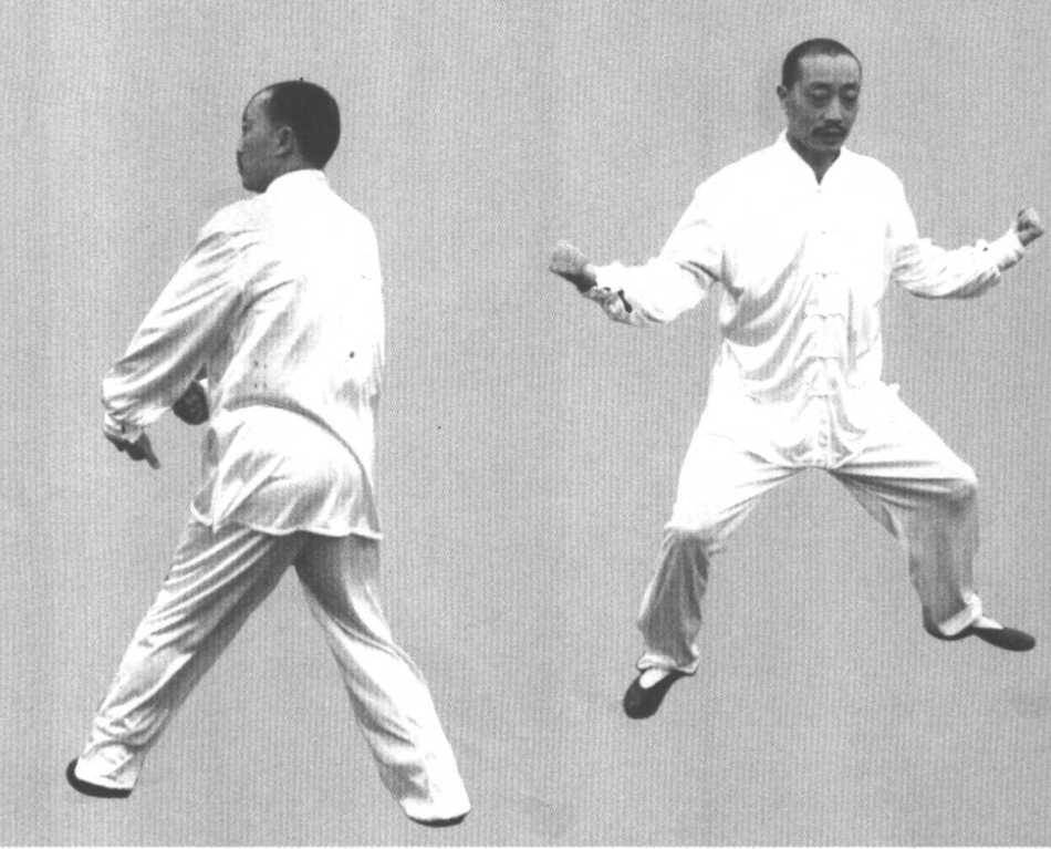 横行或横跃进步发劲,要劲起于足跟,通过腰、脊、臂、手发 出刚脆的弹抖劲,不能断劲,不能出现只有臂力发劲的现 象。