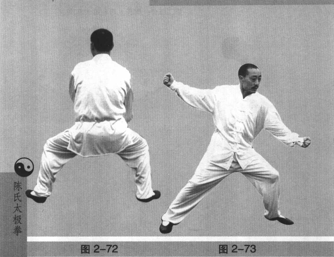 外,拳心皆向内(图2-72),接着左足向左横迈一步,重心左 移成左弓步,同时,双拳双分,左右横击,发出弹抖劲,拳心 皆向上(图2-73)。