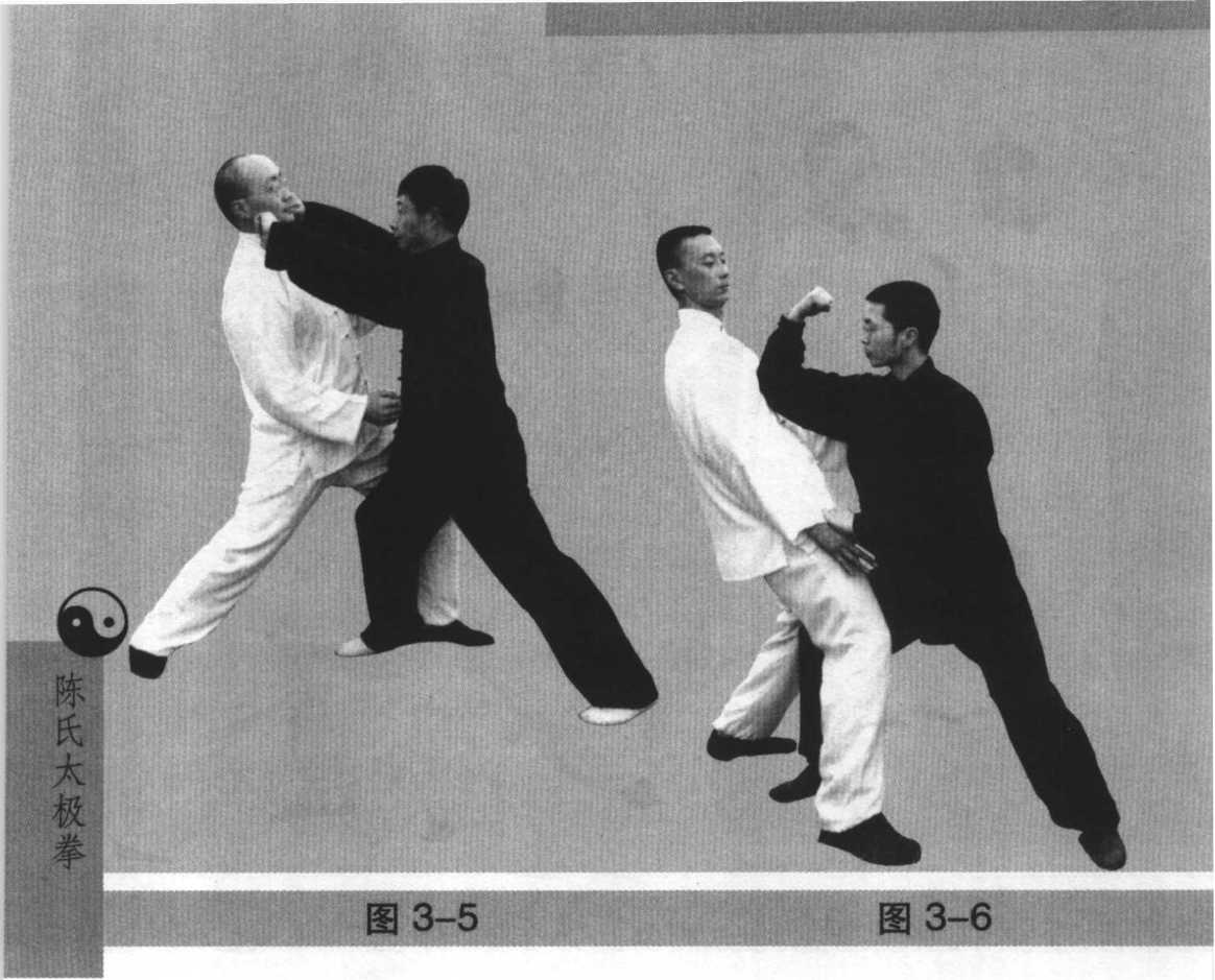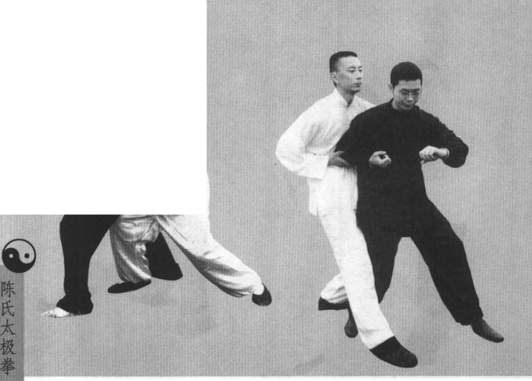 3-9),或右足前踏半步,拧腰左转,横屈右肘前按助劲,以 左肘向后发劲击其左肋部,亦可连环进步,左右发肘后击。