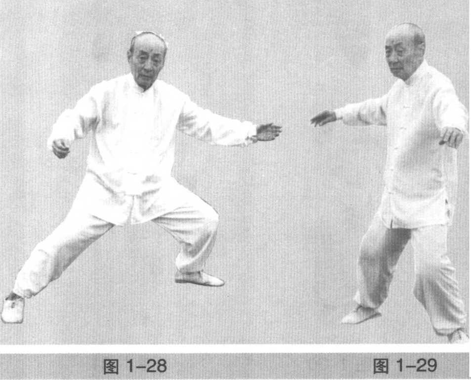 旁,两手合住劲。身体向左扭转,两手平行分开,手心均向 下(图 1-27、图 1-28、图 1-29)O