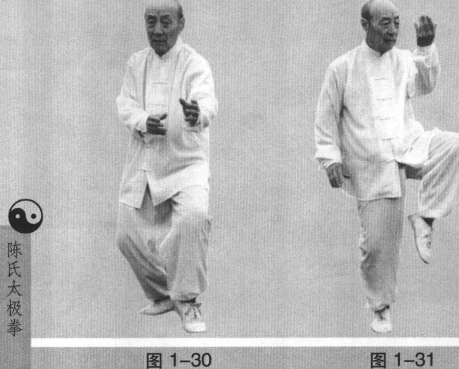 1 .重心后移,左脚屈膝提起,右腿伸直,右掌外旋下按, 手心向下。左掌右旋上托,手心反向左(图l-31)o