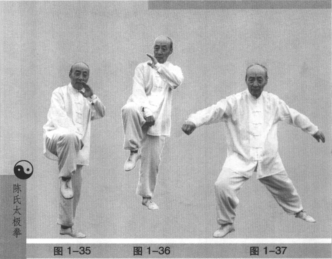 此式是在大开大合中锻炼身、手、腿的缠劲,着重以身 领手,以腰为轴缠劲的练习,全身各个关节在开合、旋转 中,亦得到灵活的锻炼。