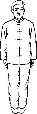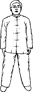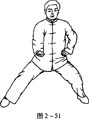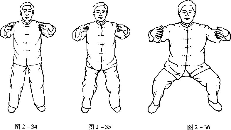 两腿分开,屈膝下蹲,重心在两腿之间,两手抬起与肩平,肘下沉,手心相对, 两眼轻闭。分高桩(图2-34)、中桩(图2-35)、低桩(图2-36)。高桩、中桩两 脚与肩同宽,低桩两脚宽于肩。