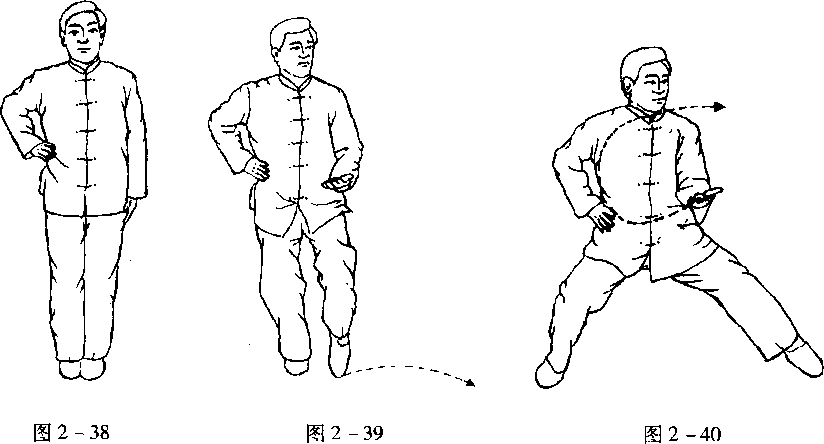 图 2 -37图 2 -37预备 身体直立,两臂下垂,然后右手叉腰,拇指在后,重心移向右腿,左脚向左开一大步,左 手伸于腹前,掌心朝上。(图2-37至40)