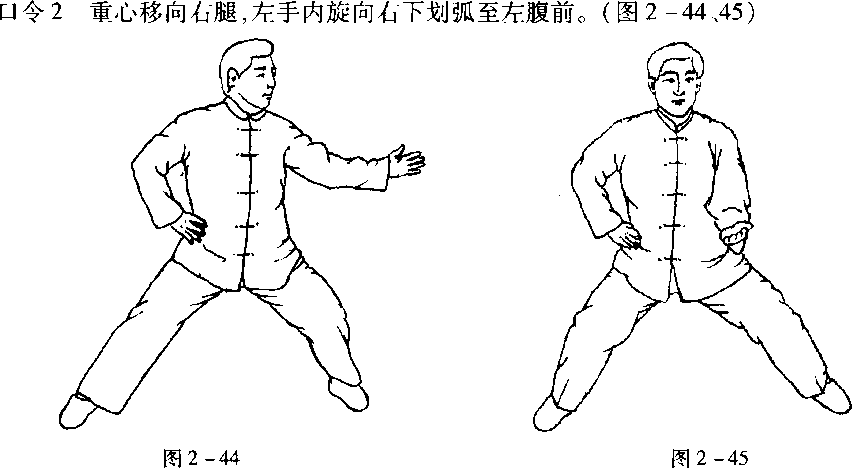 口令1左手向右上方划弧于右胸前,然后重心移向左腿,左臂外旋向左划弧于左前方,与