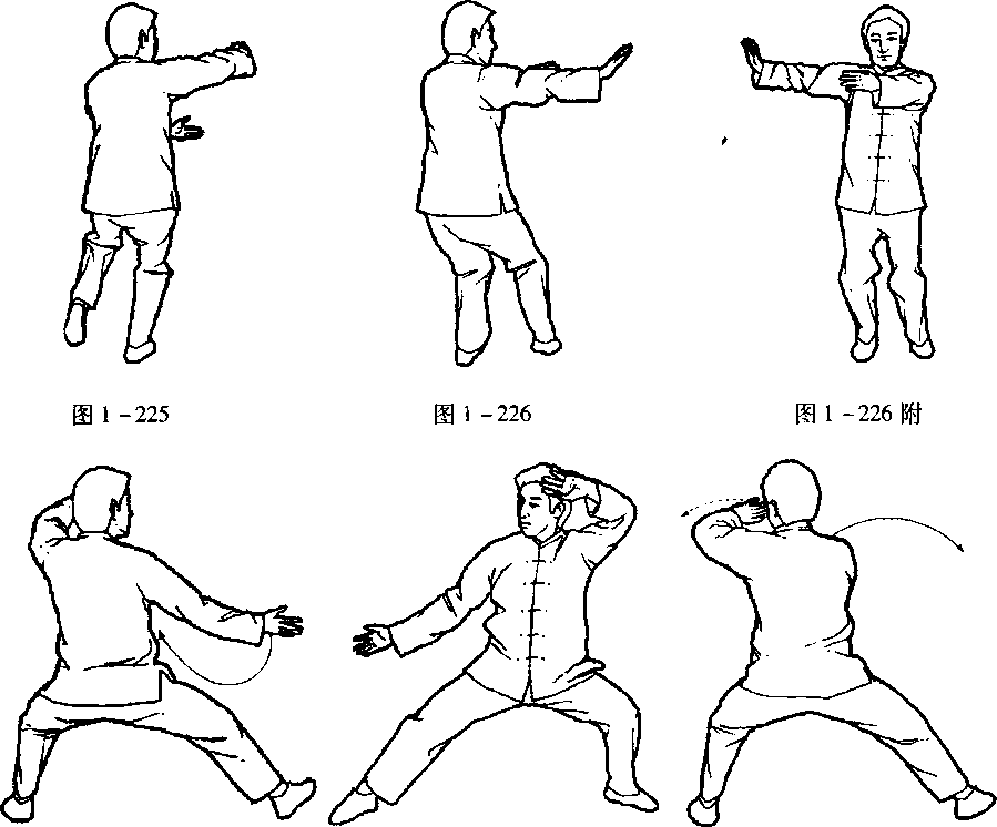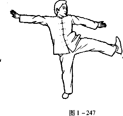口令6(图1 -246、247) 提左腿,向左侧蹬出,同时双手向两侧发出。(面向南)一