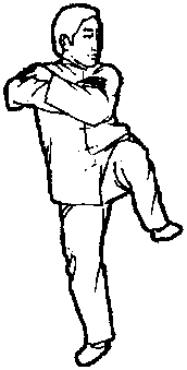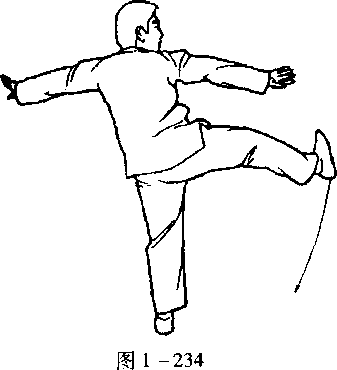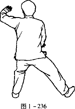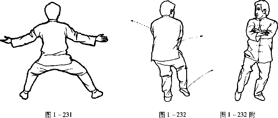 口令4(图1 -231、232) 重心移至左腿,提右脚收于左脚内侧,脚尖点地,同时两手向内
