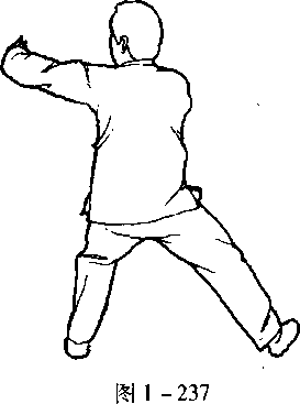 口令2(图1 -236至240) 重心移至右腿,转体180度,提左脚向左开一大步,同时左手